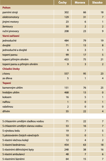 V té době bylo v provozu celkem 684 pivovarů, přičemž v Čehách 561, na Moravě 95 a ve Slezsku 28. Vedlejší tabulka je zkrácená a přesně reprodukovaná podle originálu. Případné nesrovnalosti jdou na vrub redakci Kvasu. Nekteré údaje jsou po zadumání opravdu překvapující. Samozřejmě nás nepřekvapí, ze ve Slezsku netopili hnědým uhlím, ale kupříkladu představa dřevěného chladicího stoku i topení rašelinou je fakt pozoruhodná. A jak si představit pohon pivovaru na žentour? Každopádně musíme brát tyto údaje s velkou rezervou. Ani ne tak pro jejich archaičnost, ale spíše pro velmi těžké získávání aktuálních informací v době před první světovou válkou. Redakce Kvasu sídlila v Praze a pravidelný kontakt se vzdáleným Slezskem ci neochotnými Sudetami by pro ni velmi složitý. Tím chci jen naznačit, že tato tabulka je spíš takovou představou o stavu pivovarnictví před jedním stoletím a reálná data by byla jestě daleko více překvapivá, zajímavá a ohromující.